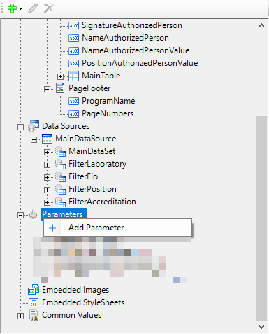 Queryнабора данныхFilterLaboratoryможно использовать SQL-запрос из набора данныхMainDataSetили, по возможности, его упрощенный вариант (исключение неиспользуемых полей и соединений таблиц); - добавить параметр в дереве отчета (рис. 5.1);