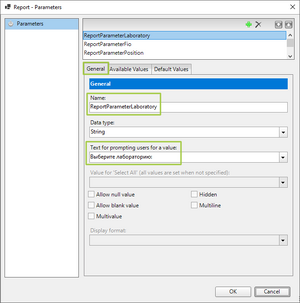 Nameввести название параметра, например,ReportParameterLaboratory(по умолчанию –ReportParameter1); - в поле