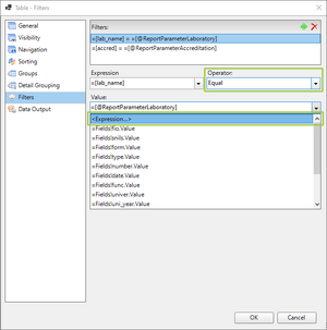 Appendдобавить пунктReportParameterLaboratoryв областьExpression:; - нажать кнопку