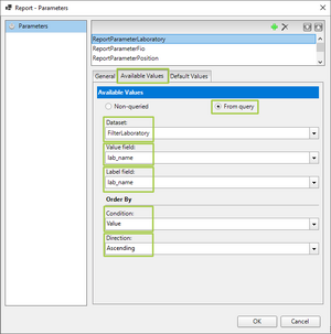 Fields:раскрыть группуParametersи выбрать пунктReportParameterLaboratory;