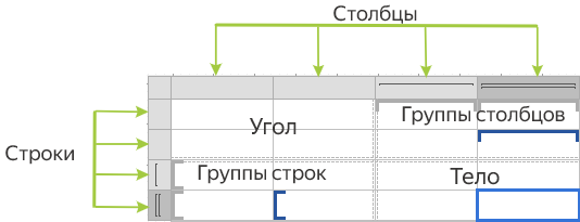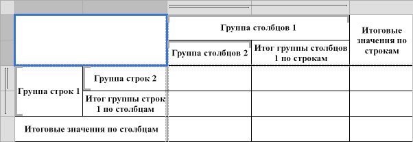 - заголовки и итоговые значения отображаются с помощью статических строк или столбцов в области данных