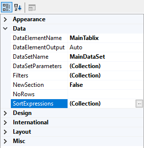 • найти блок элементов интерфейса Свойства >> Data >> SortExpression;