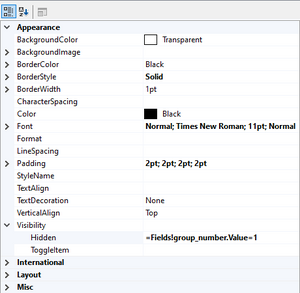 • условной итоговой командой для дизайнера можно считать следующую - в таблице в визуальном представлении (Visibility) выбранной строки данных скрыть (Hidden) строки, у которых будет выполняться введенное условие (=Fields!group_number.Value = 1), т.е. скрыть первую строку.