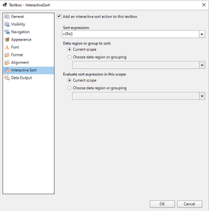 • Data region or group to sort: - выберите уровень группировки или область данных в отчете для сортировки;