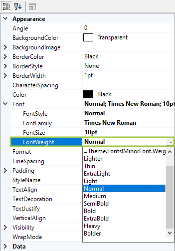 Appearance >> Font >> FontWeight– нормальный (Normal), жирный (Bold) и другие.